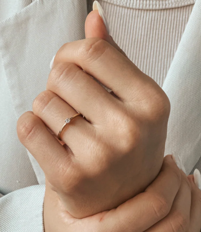 An elegant 14K solid gold ring with a 0.05 ct diamond, brilliant cut and color grade W/S-I. Its simple and refined design makes it easy to integrate into any style, adding a touch of discreet sparkle.