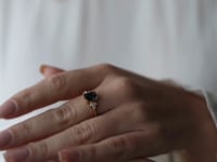 Golden Faerie - London Blue Topaz - crafted with a natural London Blue Topaz stone and zirconia, covered with a generous layer of 14K gold. The stone measures 8x6 mm and the entire ring weighs 2.2 grams.