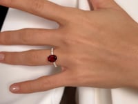 The Garnet stone has a height of 9 mm and a width of 7 mm, and the ring band is encrusted with zirconia stones.