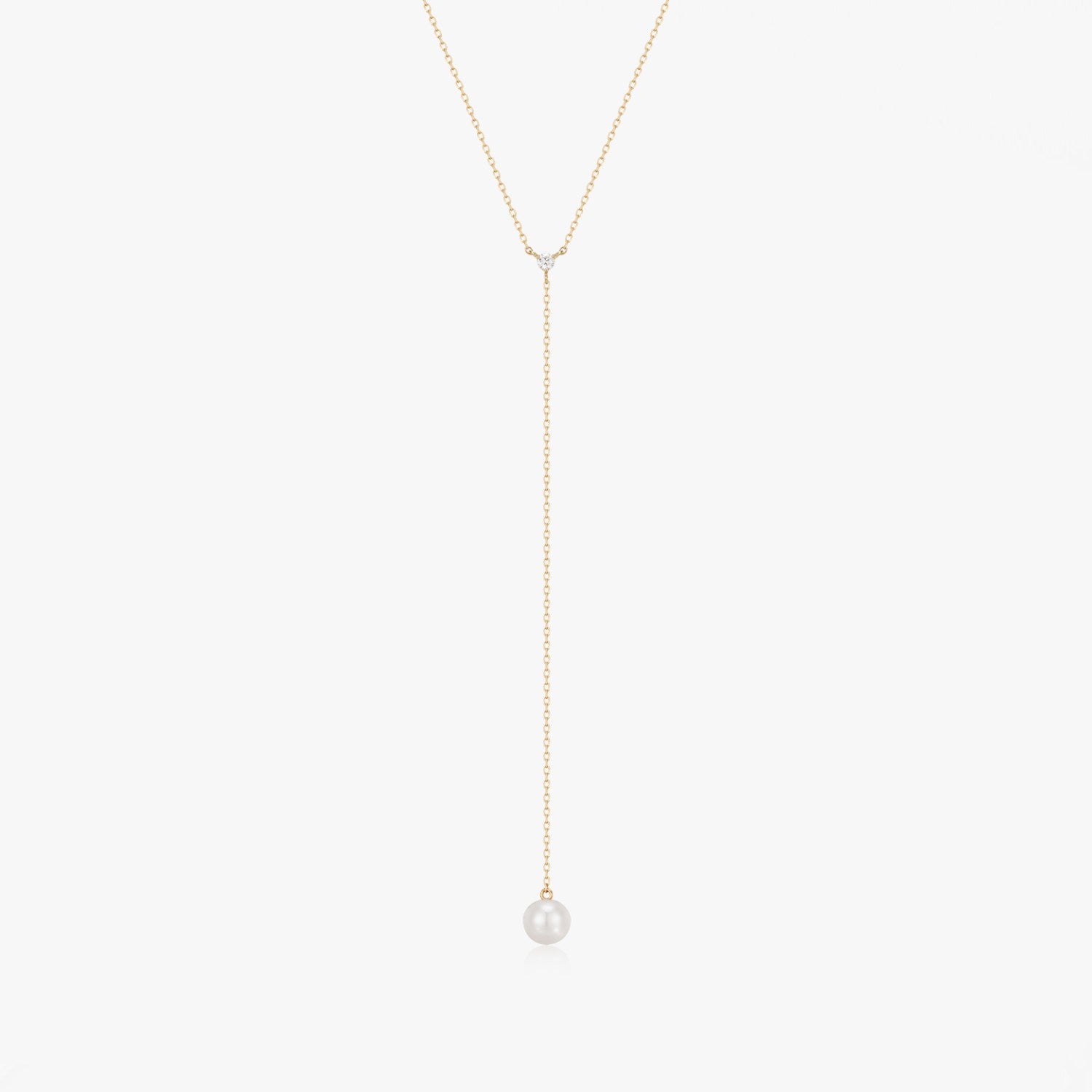 With an elegant lariat design, this gold necklace combines the brilliance of the diamond at the base with the delicacy of a natural pearl that highlights the neckline, perfect for V-neck or strapless blouses.